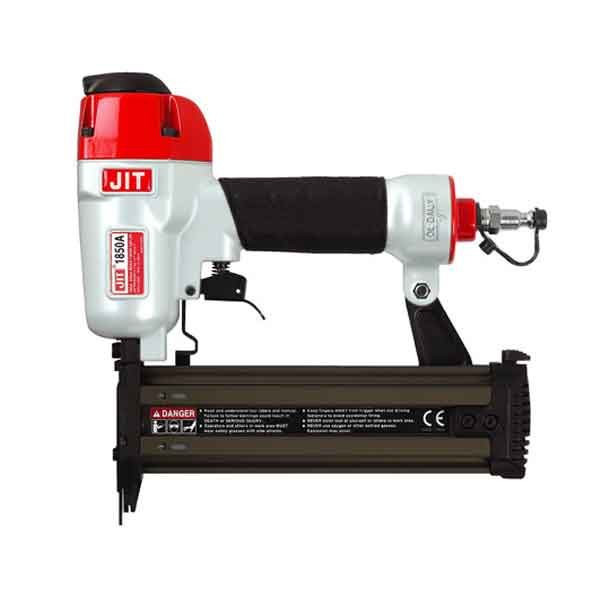میخکوب بادی جیت مدل 1850A ساخت کره جنوبی این محصول یک خشاب کشویی ازجنس آلومینیوم Die-Cast سختکاری شده دارد که از ظرفیت 100 عدد سوزن برخوردار است. به کمک این میخ میتوانید از میخهای اسکا (SK یا F) با طول 15 تا 50 میلیمتر استفاده کرده و اجناس چوبی را به هم وصل کنید. این مدل سبک و قدرتمند با وزن و ابعاد مناسبی ساخته میشود. همراه این دستگاه یک شیلنگ فنری، دو عدد آچار آلن موجود است. فشارهوای کاربردی برای این دستگاه 4تا7 بار (60-100 psi) است. گیج مفتول مناسب آن نیز از نوع 18 و دهانه خروجی میخ هم 7 میلی متری است. طراحی دستگاه نیز براساس اصول ارگونومیک بوده و استفاده از آن در مصارف طولانی مدت را راحت میکند. طراحی روکش پلاستیکی دسته نیز از نوع ضد تعریق بوده تا استفاده راحتتری برای کاربر فراهم شود. میخکوب 1850A JIT مجهز به ضامن ایمنی است که باعث میشود تنها زمانی دستگاه عمل کند که به قطعه چسبیده باشد و در صورت ضربه خوردن و…عمل نمیکند تا ایمنی تامین شده و همچنین طراحی آن به گونه ایست که جلوی دید کاربر را نگیرد و محل دقیق کوبیدن میخ مشخص است.