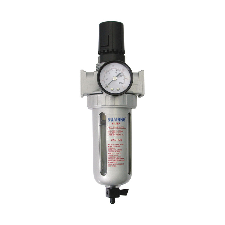 بادی که در کمپرسور هوای یک مجموعه تولید میگردد هنگام طی مسیر تا دستگاه پنوماتیک دچار یک سری آلودگی ها نظیر ذرات فلزی و آب میگردد این آلودگی ها موجب آسیب به اجزای درونی ابزار های بادی میشود برای پاک سازی و جذب رطوبت هوای فشرده ورودی به دستگاه بادی باید از واحد مراقبت تکی استفاده کرد. در بعضی از صنایع مانند رنگ اتومبیل ورود آب و ذرات اضافی به رنگ میتواند ضررهای جبران ناپذیری به کار بزند و این ذرات وارد رنگ شده و کیفیت رنگ آمیزی را بسیار پایین بیاورد.به همین منظور استفاده از واحد مراقبت سوماک به شما پیشنهاد میشود. این واحد مراقبت پنوماتیک با ورودی و خروجی 1/2 اینچ معادل 12/7 میلیمتر قابل نصب بر روی کمپرسور های باد 25 تا 250 لیتر است و توانایی انتقال هوا به اندازه 2200 لیتر در دقیقه دارد. این مدل واحد مراقبت سوماک دارای مخزن رطوبت گیر 80 لیتری و یک گیج عقربه ای تنظیم فشار باد از 0 تا 14/7 بار است. همچنین این ابزار دارای یک شیر تنظیم کننده باد است که این مزیت به شما کمک میکند تا بتوانید فشار باد را به طور دلخواه مورد نیاز خود تنظیم کنید.همین امر موجب جلوگیری از ورود باد بیش از حد و یا کم فشار به ابزار بادی شما شده و ابزار در بهترین شرایط خود به کار ادامه میدهد و طول عمر دستگاه بادی بسیار بالا میرود.