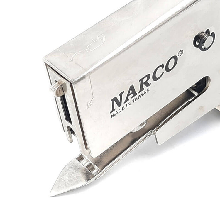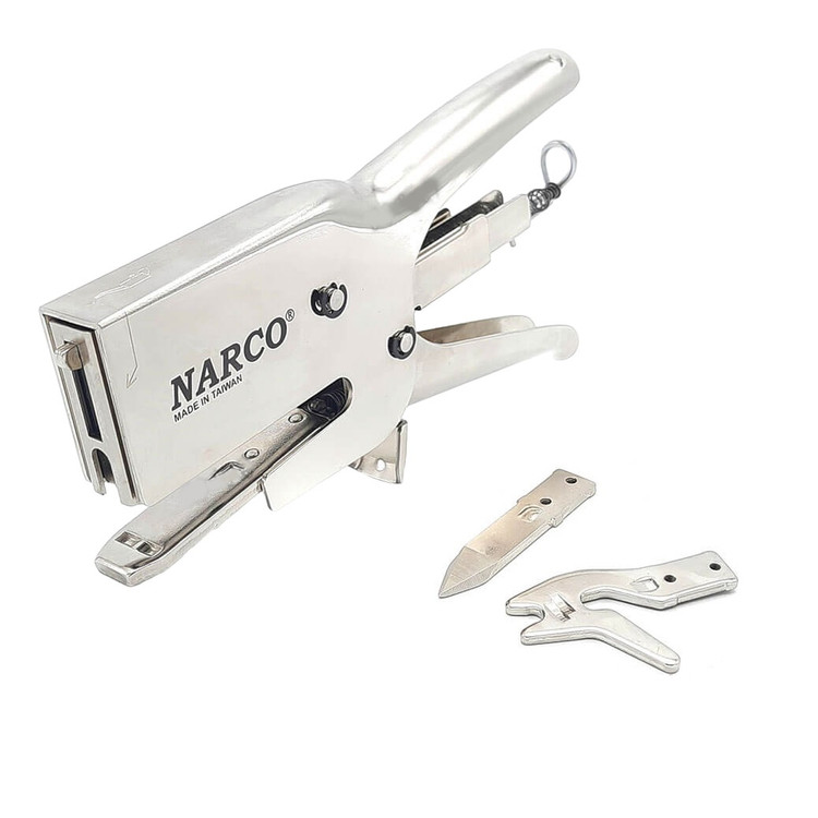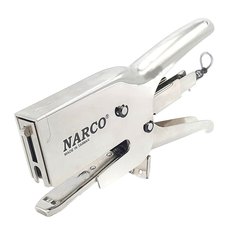 منگنه کوب نارکو ساخت تایوان بوده و دارای کیفیت بی نظیر می باشد. بیشتر صنایع مواد غذایی که با بسته بندی های کارتن و پلاستیک سر و کار دارند برای بسته بندی از منگنه اسفاده میکنند. یکی از دستگاه منگنه کوب دستی های کاربردی برای این کار که تفاوت بسیاری با منگنه کوب های معمولی دارد منگنه انبری فشار قوی نارکو مدل 550612 است. این دستگاه دارای دهانه ای با عمق 67 میلیمتر است که به راحتی میتوانید کارتن یا جسم مورد نظر را داخل دهانه قرار داده و منگنه کنید. تفاوت آشکاری که این دستگاه با دیگر دستگاه های منگنه کوب دستی دارد قدرت و نوع منگنه آن است. منگنه های این دستگاه پهن تر از منگنه های معمولی بوده و همچنین ارتفاع پایه های بیشتری دارد. هر چه ارتفاع پایه منگنه بیشتر باشد کارتن هایی با ضخامت بیشتر را میتوانید منگنه کنید.تنها منگنه ای که میتوانید در این دستگاه استفاده نمایید منگنه کد T55 هست. ارتفاع این منگنه از 6 الی 12 میلیمتر در بازار موجود است. یکی از قابلیت های این دستگاه همراه داشتن سه نوع زبانه متفاوت و کاربردی است. اولین نوع زبانه، زبانه ساده است که بیشترین کاربرد را دارد و برای اکثر کار ها قابل استفاده است. نوع دیگری از این زبانه ها، زبانه نوک تیز است. کاربرد این زبانه نیز متفاوت است که یکی از موارد آن منگنه کردن در کارتن هاست. توسط سر تیز این زبانه کارتن را سوراخ کرده و پایه های منگنه از زیر جمع میشود. بیشترین موارد کاربرد منگنه دستی انبری نارکو جهت منگنه کردن تعداد زیادی کاغذ به یکدیگر است. بین 50 الی 70 برگ را میتوانید توسط این دستگاه به یکدیگر منگنه کنید. یکی دیگر از کاربرد های رایج این دستگاه برای منگنه کردن کارتن های 3 لایه با حداکثر ضخامت 6 الی 8 میلیمتر به یکدیگر است.